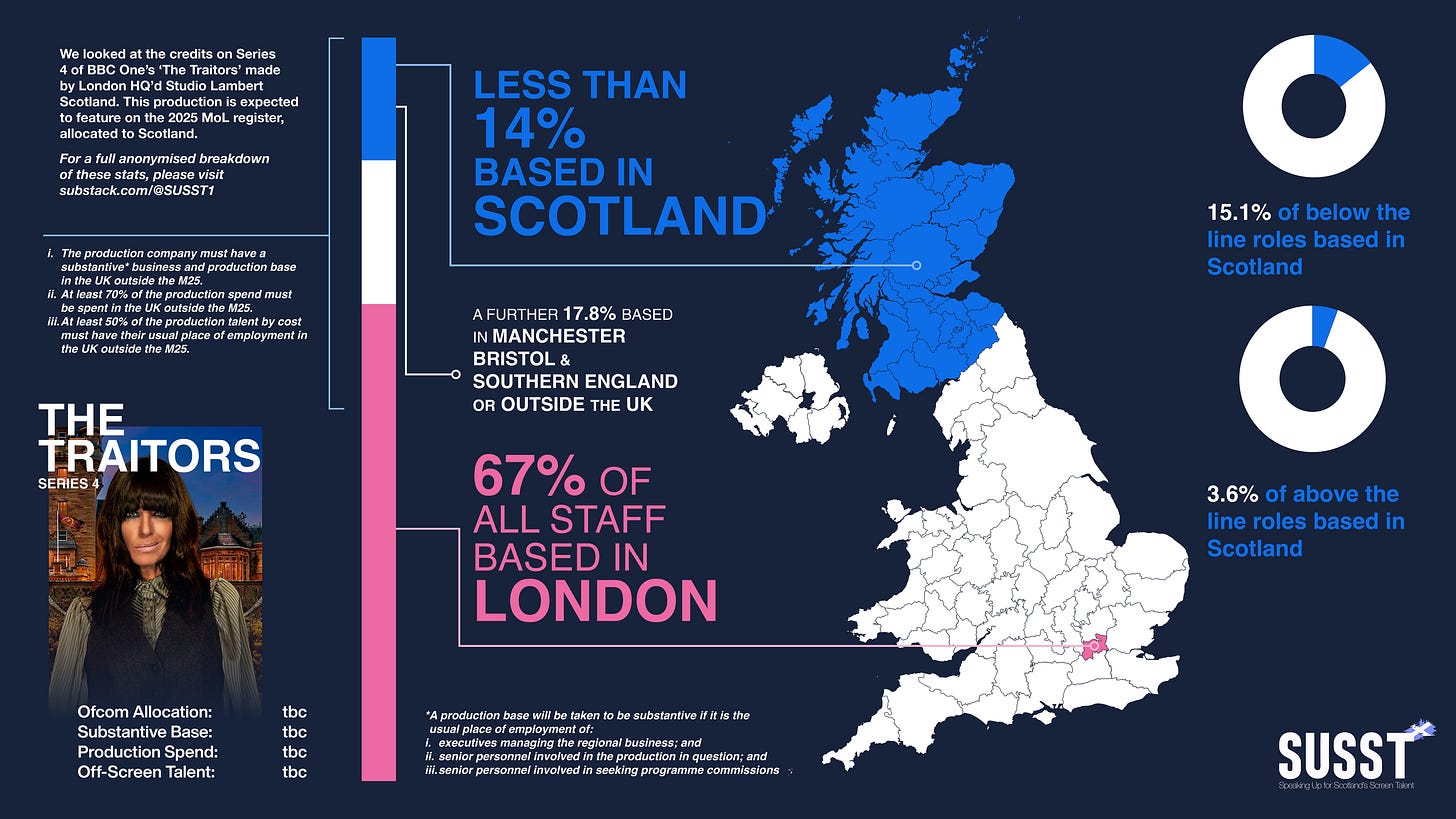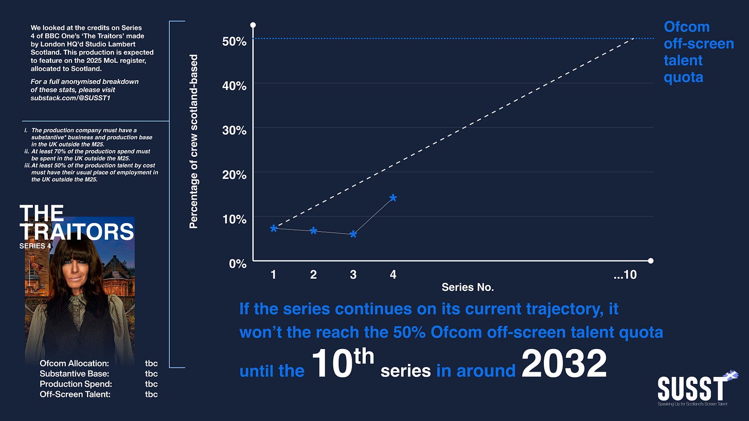 The percentage of off-screen talent based in Scotland hired to work on S4 compared to the average for S1-3 increased by 6.8%. To Celebrity Traitors, just 0.16%, most likely explained by these two production essentially being filmed back to back.