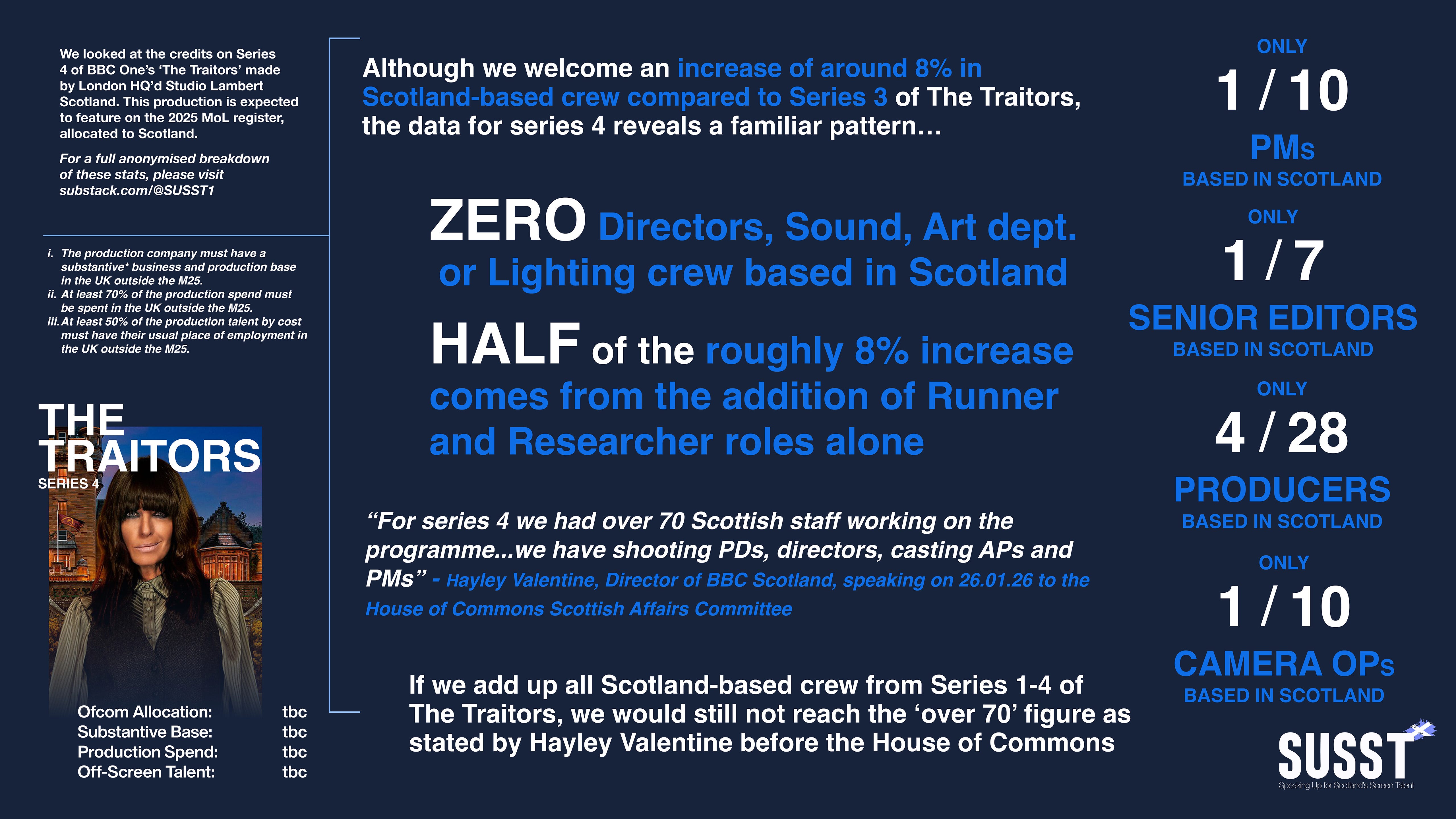 Kirsteen Sullivan: “I wondered if you could provide the number of Scotland-based production staff who worked on series 4 of "The Traitors" and the seniority of those roles?